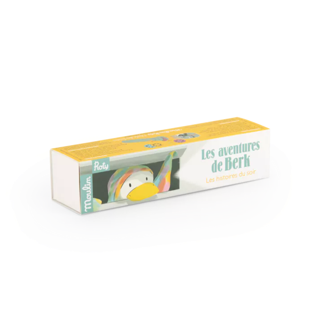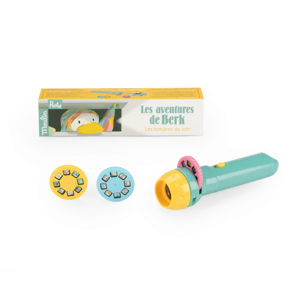 Pocket story torch featuring 3 slide discs to project on the wall, each telling the adventures of Berk, the brave yet clumsy little duck. Created in collaboration with the children's publisher l'école des loisirs.